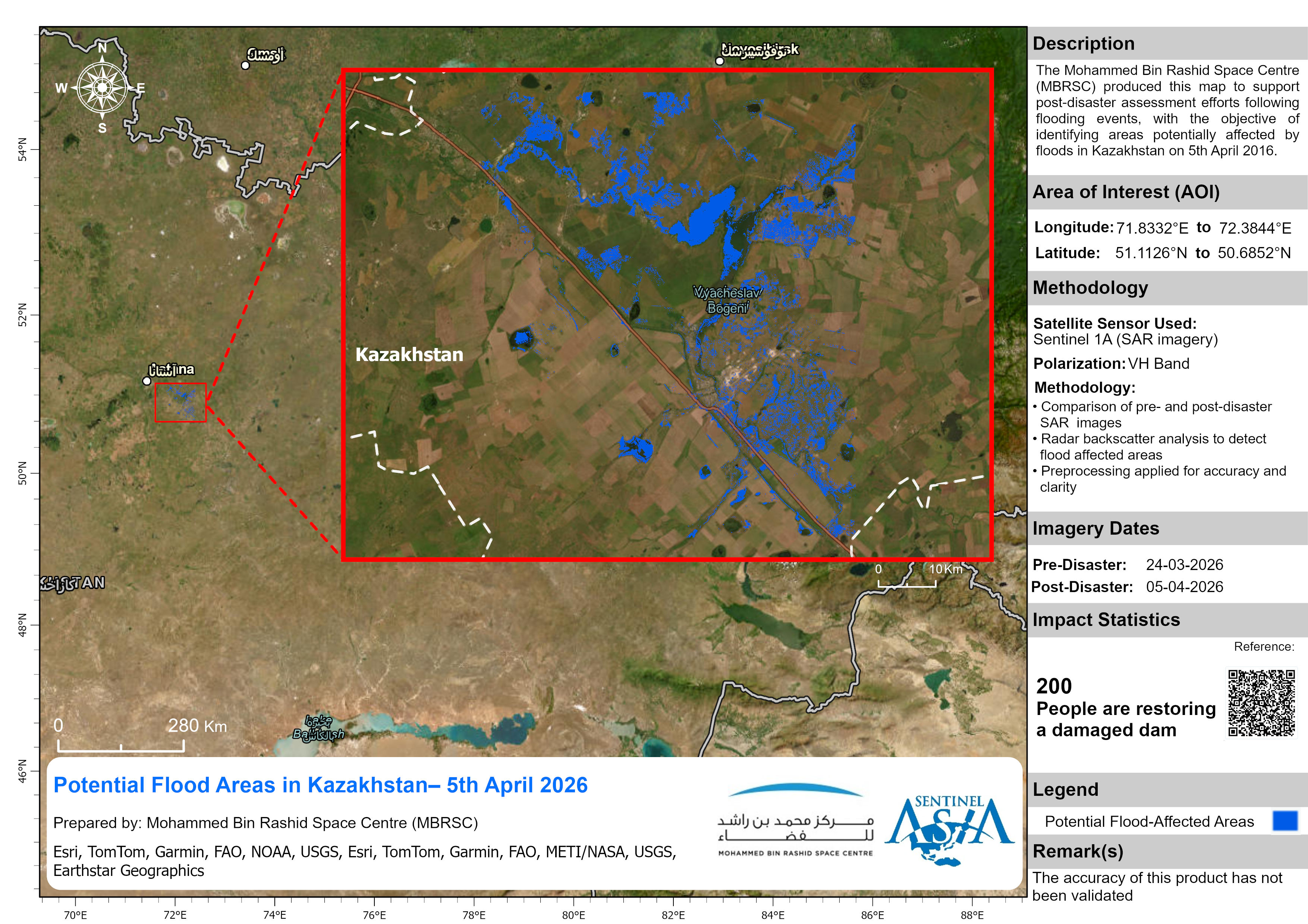 The collapsed of dam in Kazakhstan. The emergency occurred between April 5 and 6, 2026, at approximately 1:30 a.m. in the Korgalzhyn district of the Akmola region of Kazakhstan. A breach occurred at the Shoptykol dam in the Korgalzhyn district of Kazakhstan's Akmola region, 2 km from the village of Sabyndy. Emergency services, including 170 personnel and 43 units of equipment from the MES, police, and road crews, are working to reinforce the levee and divert water. According to the Ministry of Emergency Situations and 'KazAutoZhol,' no flooding of the Astana–Korgalzhyn highway has occurred; water is currently spreading through fields, and culverts are handling the flow as normal.
